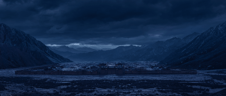 同样被评价为可做壁纸场景的还有陈星与师父对话时出现的漫山红叶的山头、陈星等人骑马走过的洒落夕阳的木桥、大雪纷飞下凄冷的襄阳等。这部分主要涉及到视觉美术设计中colorkey的绘制,也就是大家常说的灯光氛围图,主要作用是为了给后期调色做参照。因此,colorkey的绘制要求画师们具备出色的光影、色彩敏感度,只有将这两者运用得恰到好处才能正确地传递故事蕴含的意境,才能让观众真切地感受到该场景下的真实情绪。
