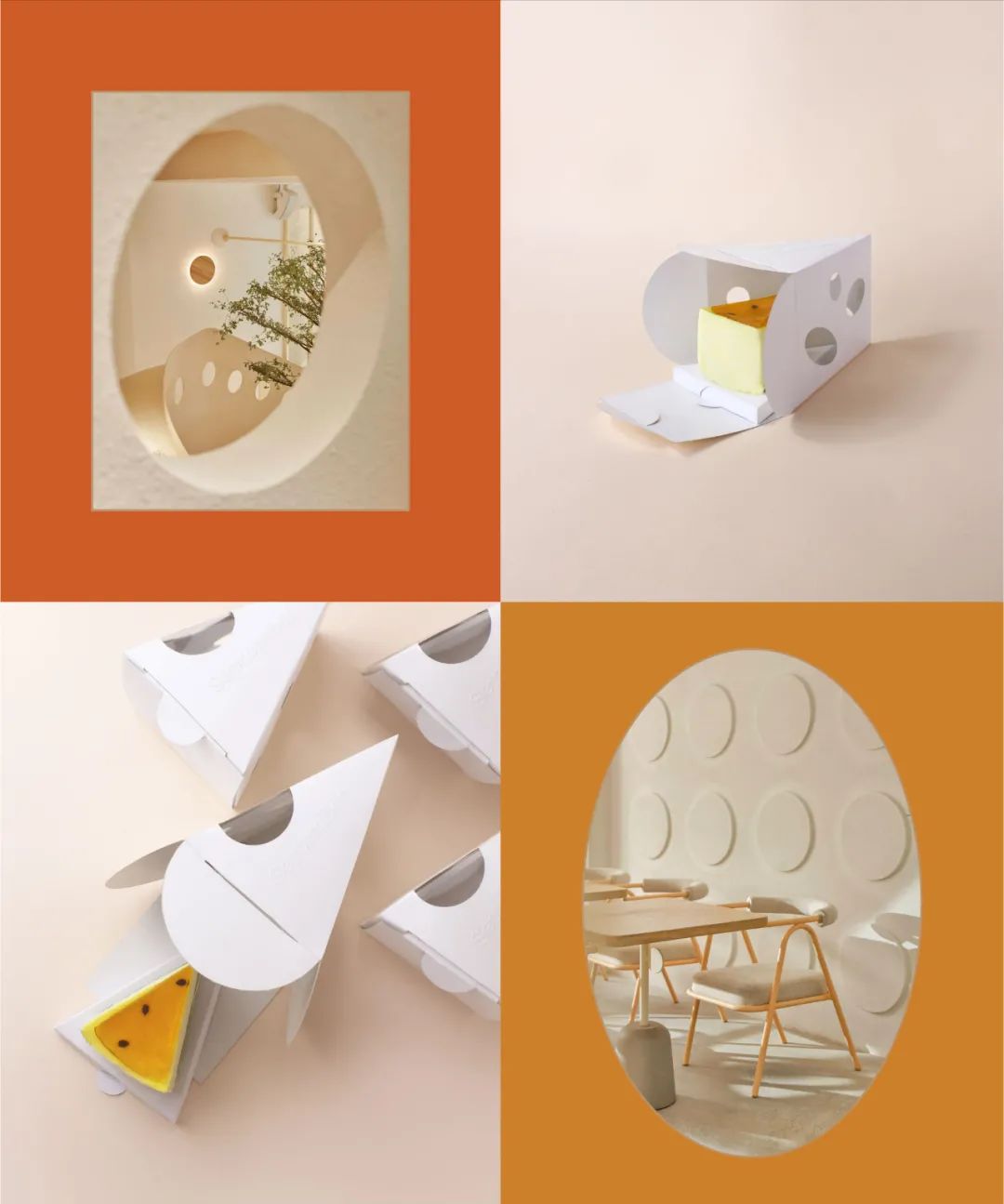 品牌选择秋季作为室内视觉效果主要概念,因为主理人认为秋天是一个迷人的季节,于是以金秋九月、咖啡和蛋糕裸色为基础作为视觉核心,基于其第一家咖啡店内部的奇特椭圆形窗户元素的启发,透过被秋天的水彩元素包围的小窗户形状,让视觉和字体设计优雅地绽放开来。