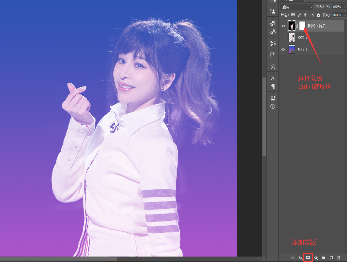 Ctrl+i反选蒙版, 选择画笔工具选择白色涂抹出需要的部分。如下图所示: