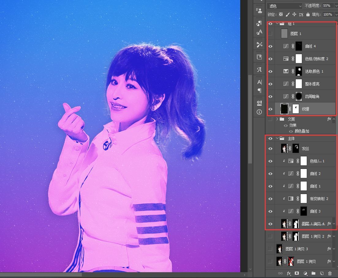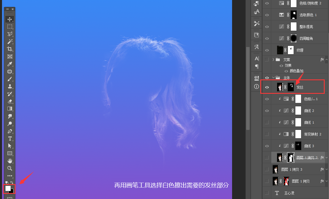 因为发丝是滤色层所以图层一直只能放在渐变滤色层的上面。