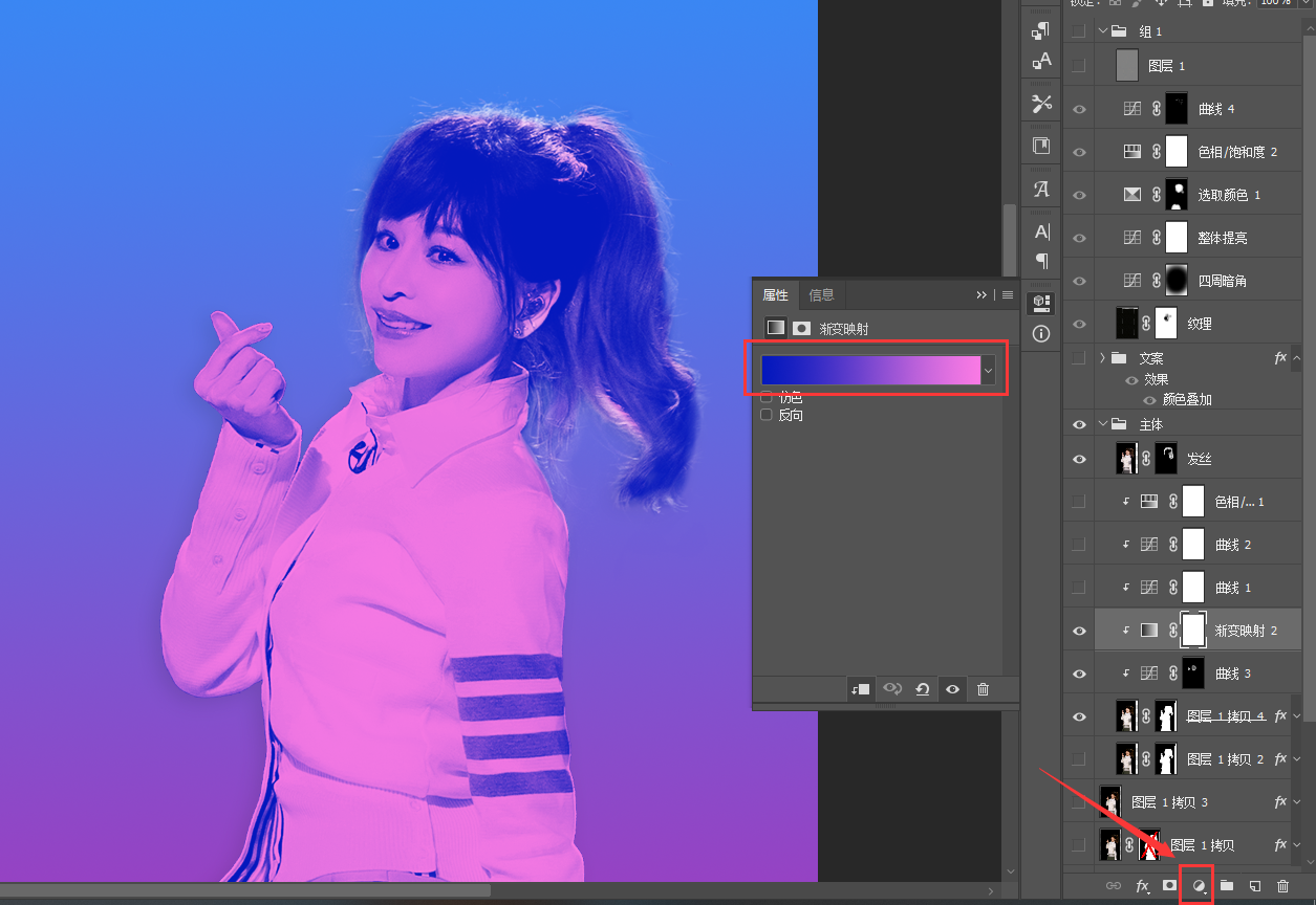 第三步:将主体添加渐变映射(这是双色调设计的关键)