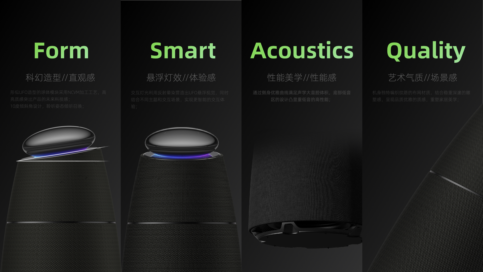 天猫精灵设计团队在Sound系列的工业设计过程中,通过「形 | Form」、「智 | Smart」、「声 | Acoustics」、「质 | Quality」的设计策略,完成了产品形态塑造、智能化体感、声学性能及品质感表达,获得了积极的用户反馈及市场表现。