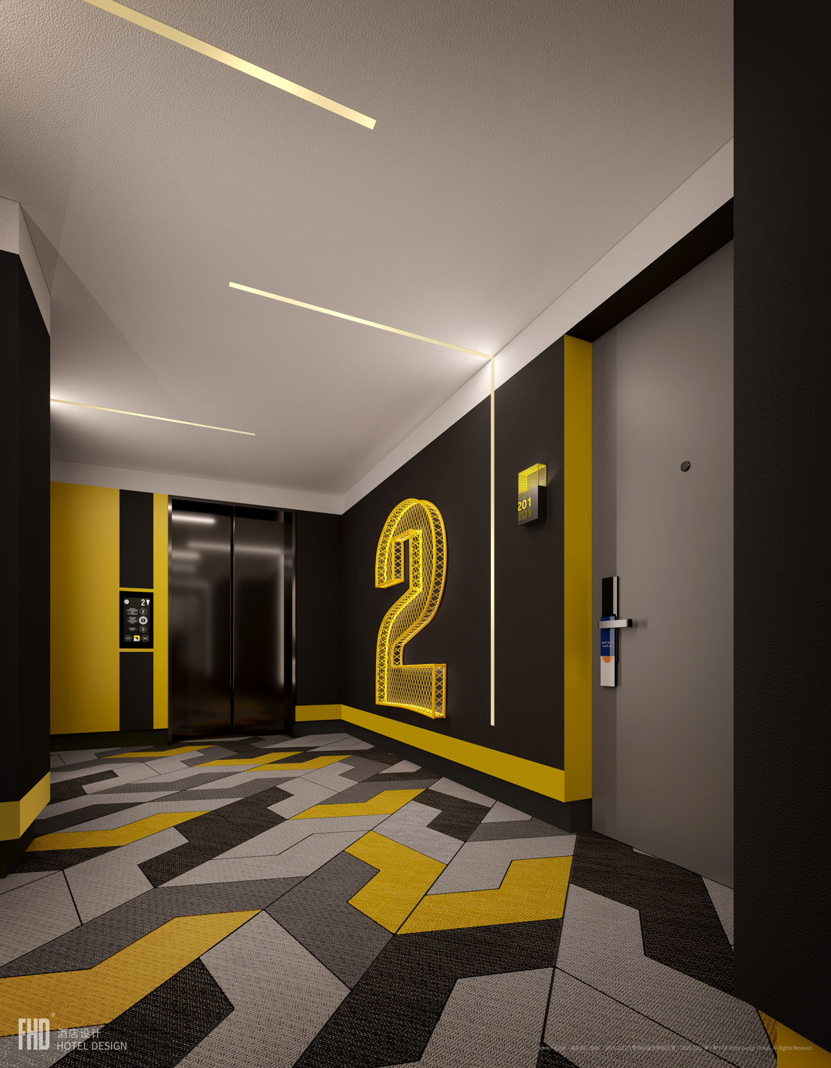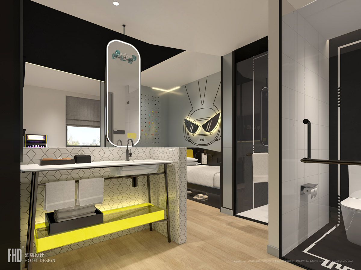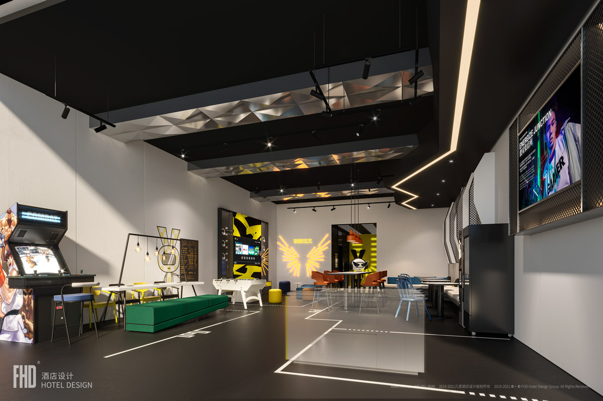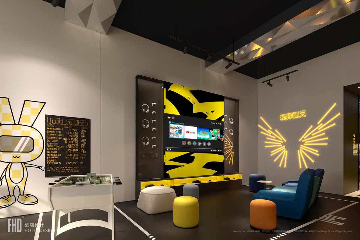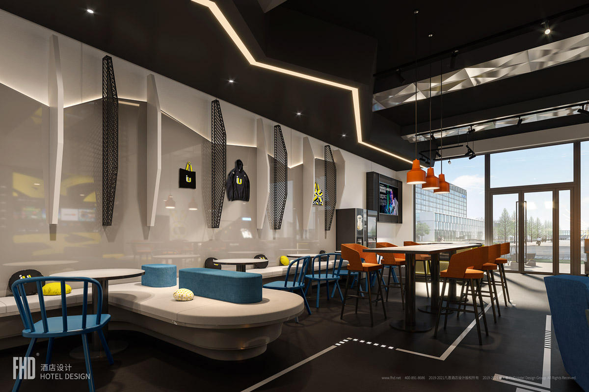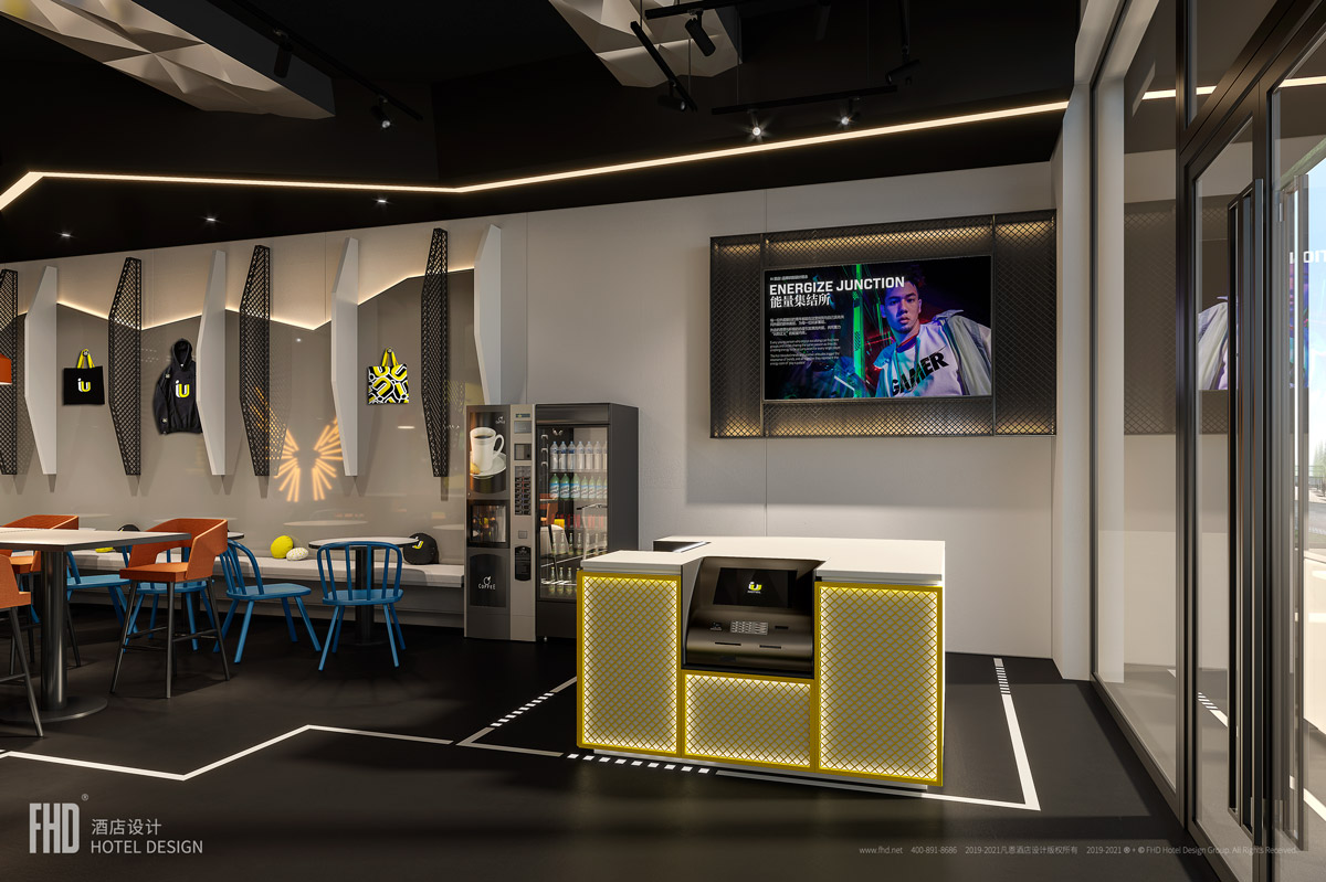 半开放式公区,搭配撞色设计和自助入住办理前台,让酒店更具科技感;