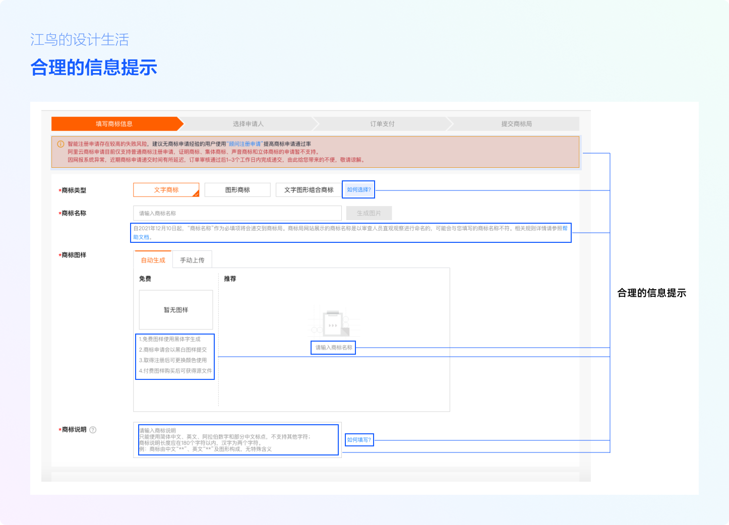举个例子,当我们进入阿里云的商标注册模块中,模块内包含了大量的提示性说明,帮助用户解决在填写过程中的疑惑,减少内容的记忆。当用户看到这些信息仍无法解决的时候甚至提供了获取更多帮助信息的指导入口。