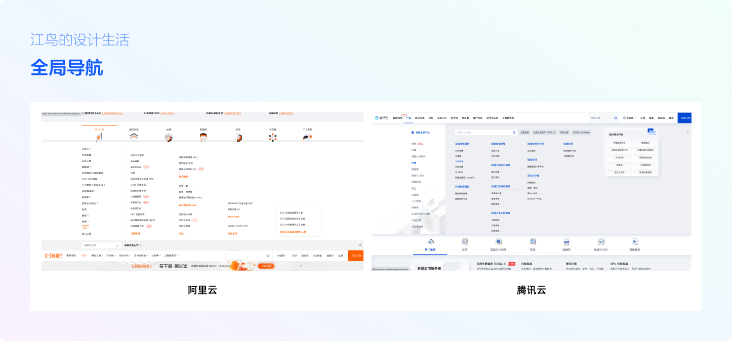 例如,不管我们进入哪个云计算平台,它的导航都可以通过鼠标悬停顶部导航的「产品」获得,这种容纳较多选择的导航菜单已经已经被用户所熟悉,设计的时候可以节省决策时间。把更多的时间留给细分场景下的元素布局。