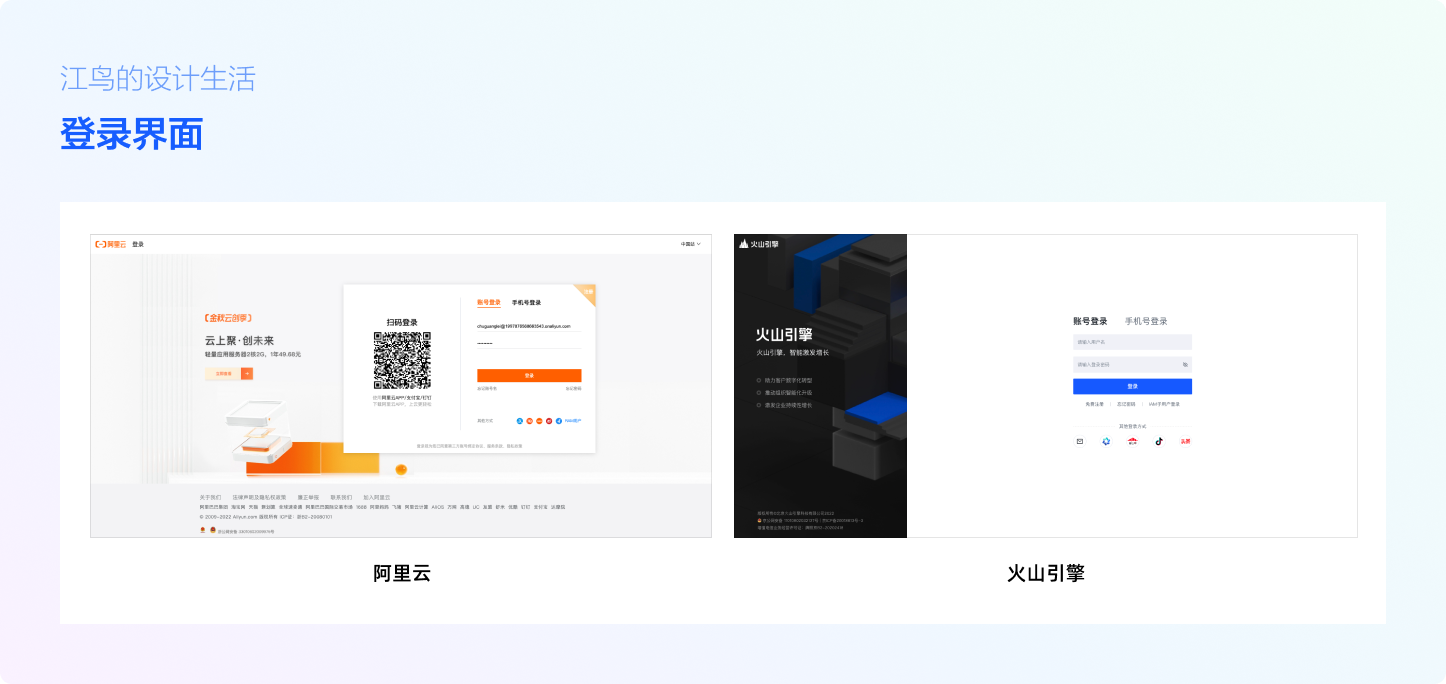 例如当用户在登录场景下,我们的核心操作是选择登录方式、输入和点击。阿里云以及火山引擎都通过高色差的比对,将信息输入以及按钮点击这两个核心操作进一步凸显。利用颜色的差异以及字体粗细引导用户决策,吸引用户直接点击。