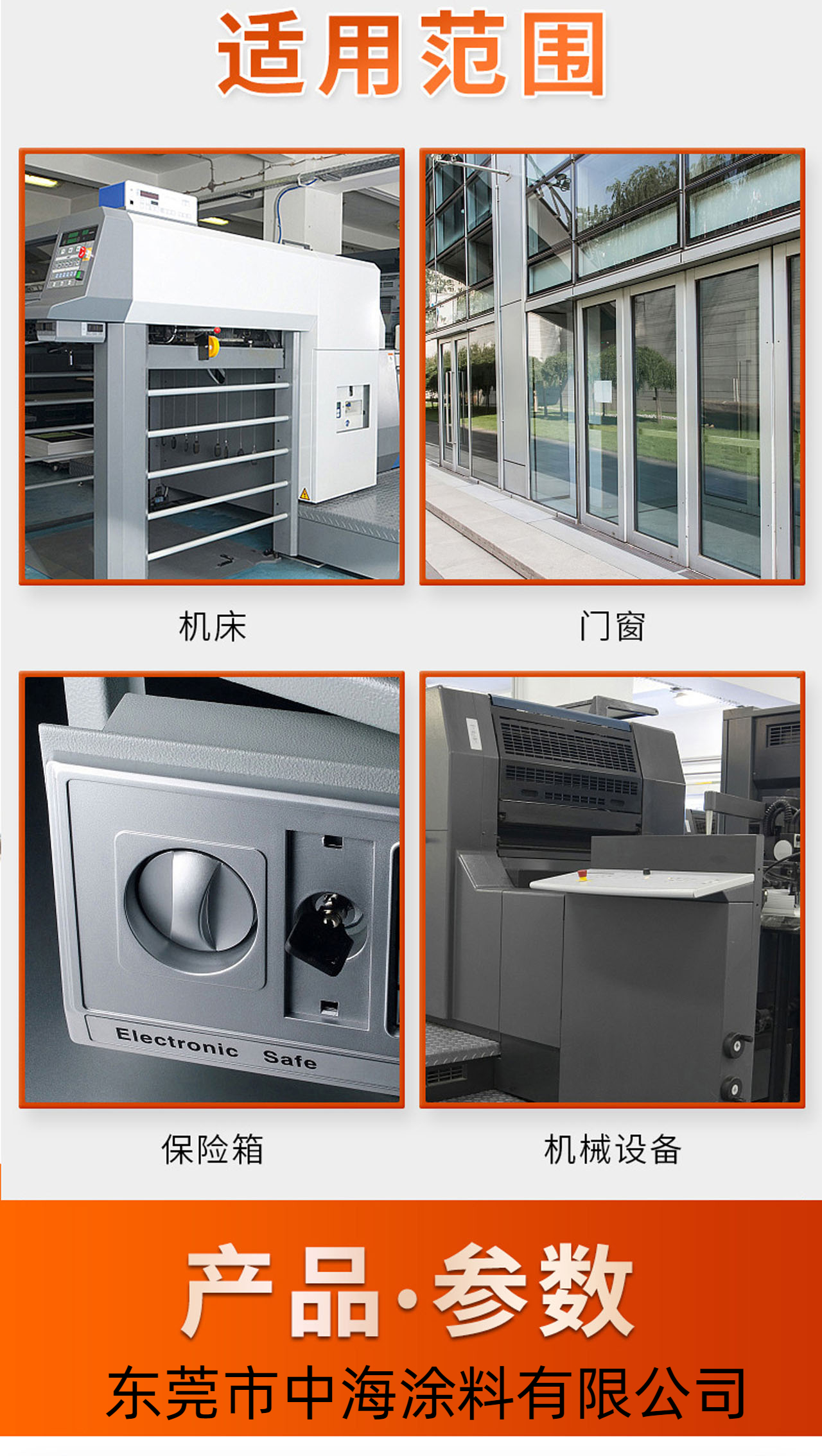 有出口机械设备专用金属漆、环保型机械设备专用漆、减速机专用金属漆、食品级机械设备漆、包装设备金属漆、工程专用装饰漆、丙烯酸桔纹漆、开花型锤纹漆、闪光金属漆、氟碳金属漆、闪光金漆、环氧底漆等。