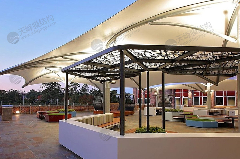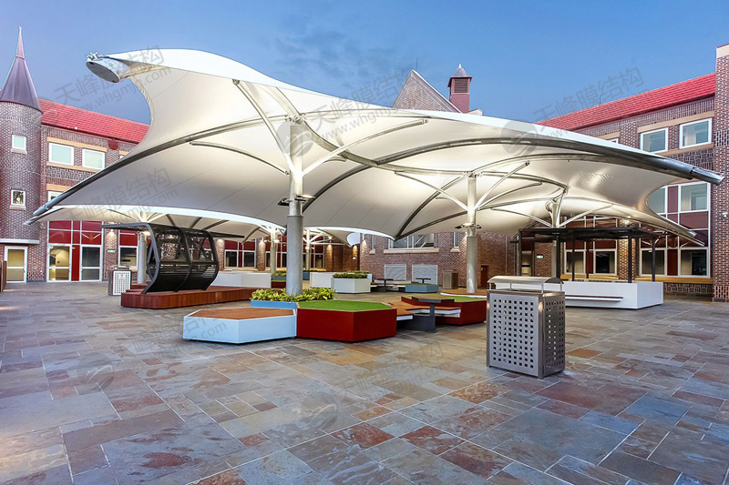 武汉膜结构_酒店景观膜结构能够提供多种用途,如休息,观赏,遮风挡雨等。并与周围环境融为一体,增加了酒店周围环境的艺术性。