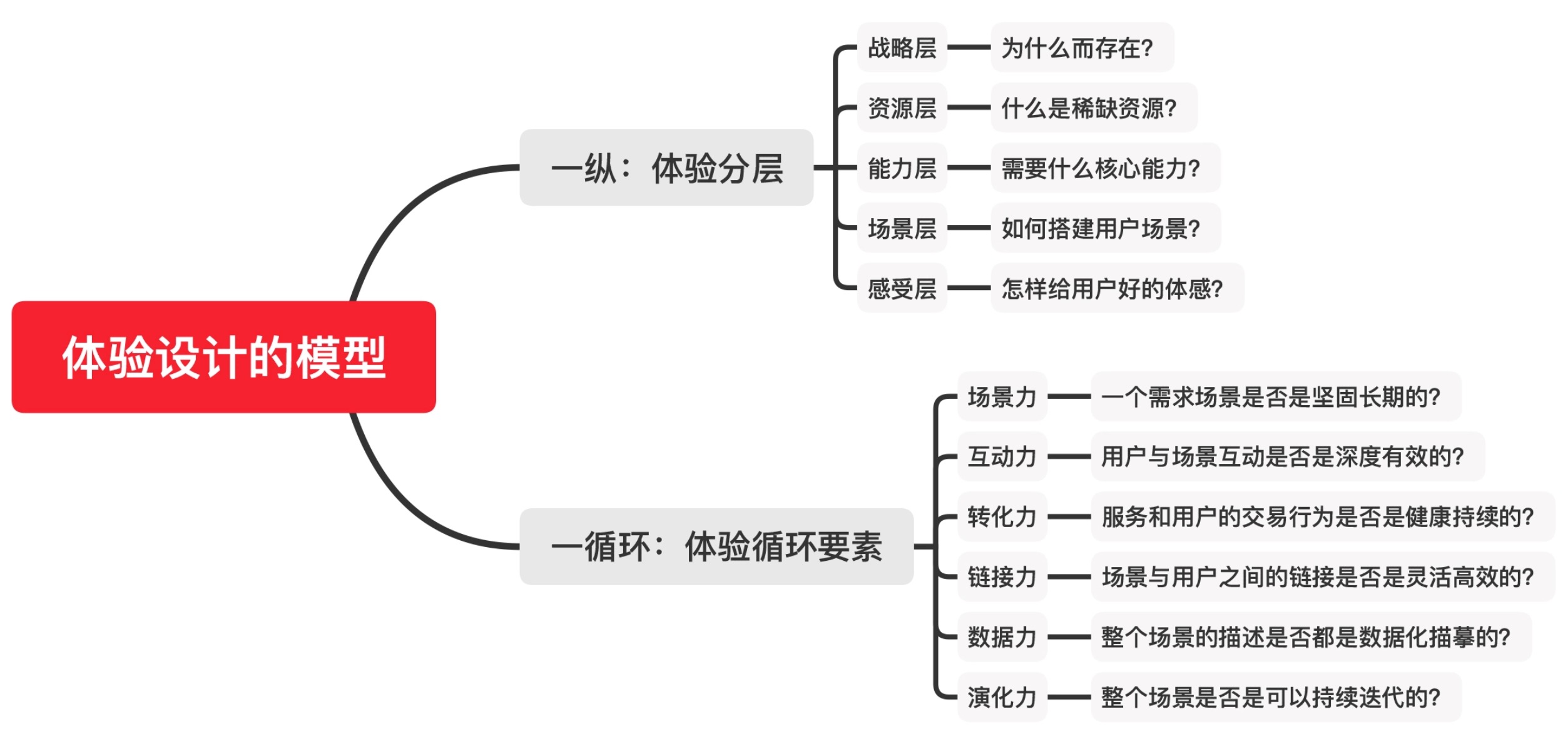 而一个产品体验的模型,往往可以从两个维度去看,一纵一循环。所谓的一纵,指的是体验的层次;一循环,指的是体验模型的循环要素。那么接下来就根据这个划分原则,一起拆解一个公司的体验模型。