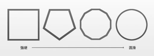 上图中我们可以看到,方形过度到圆形的变化,圆形是由极其细小的边角组成,在变化当中图形变得越来越有乐趣,比较下来圆形在几何图形中具有平滑流畅的边缘,圆形更让人感觉轻松,愉悦。设计需要增加乐趣的时候,我们可以多运用流畅线条的图形来让页面活跃起来。