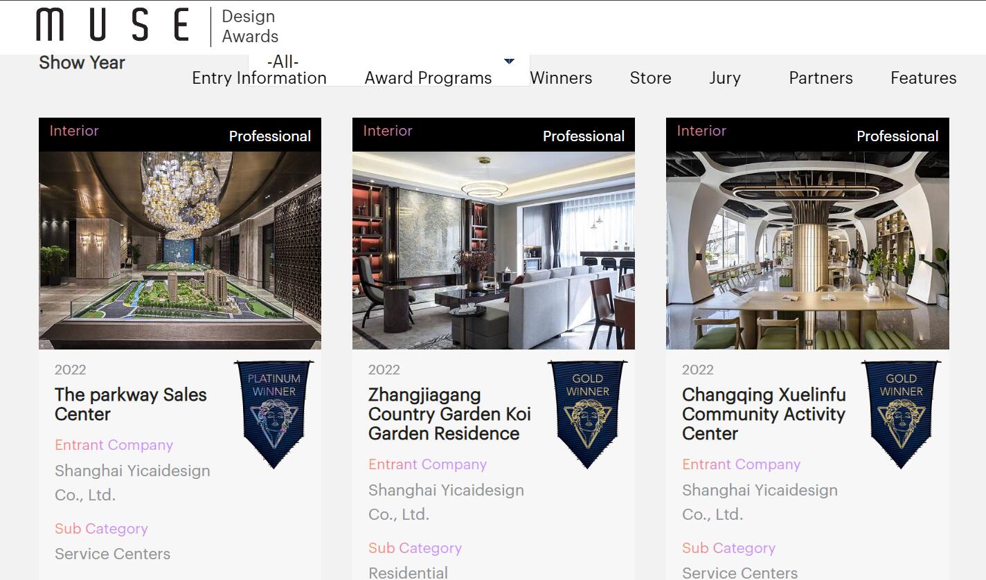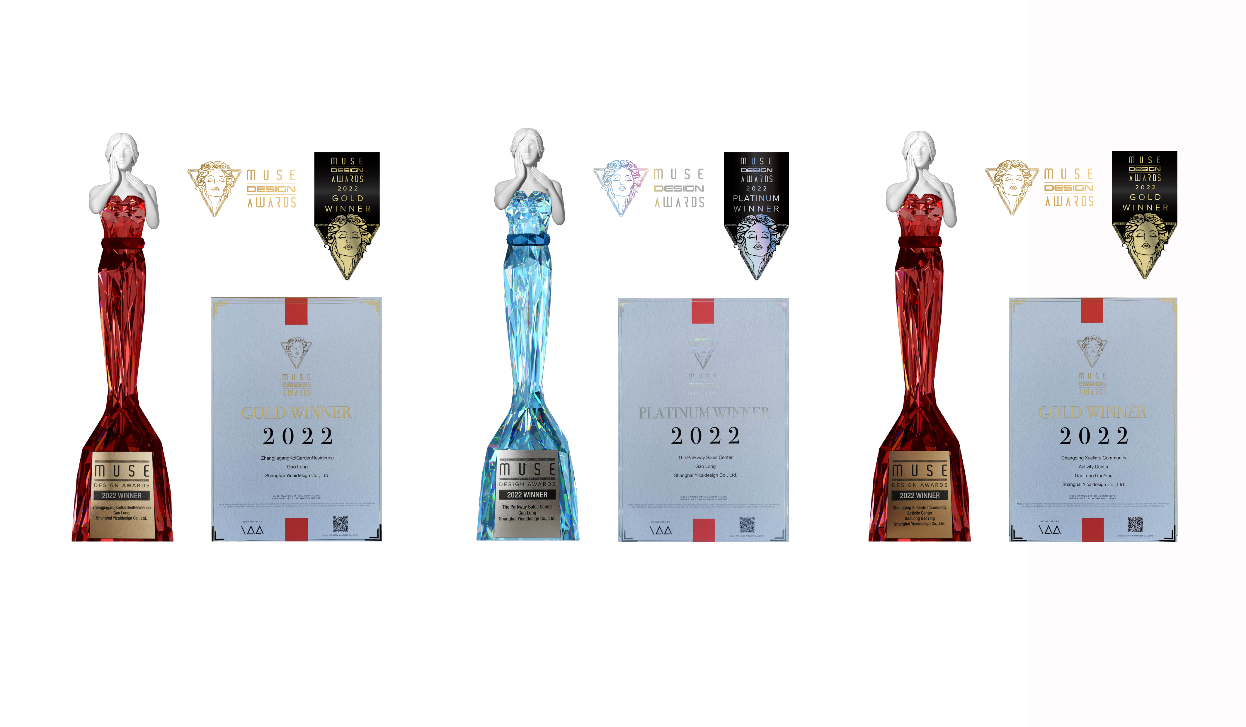 近日,2022美国MUSE缪斯国际设计奖组委会传来捷报,由上海熠彩设计创始人\设计总监高龙设计的作品《The parkway Sales Center》与《Changqing Xuelinfu Community Activity Center》《Zhangjiagang Koi Garden Residence》在100多个国家/地区近40000份参赛作品中脱颖而出,分别荣获2022美国MUSE设计奖室内设计最高荣誉-铂金奖和两枚金奖,受到众多的同行和媒体的关注。