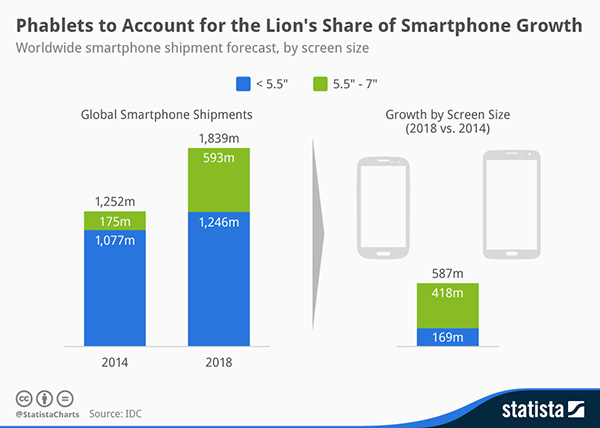 研究显示,人们在移动设备上比从前消费了更多的视觉内容。手机的主要功能,通话,使用率有所下降。记住这点,就不会太惊讶于平板手机份额在2018年以前都会以36%的速度上涨,同时其他智能手机每年只上涨4%,数据来自Statista。