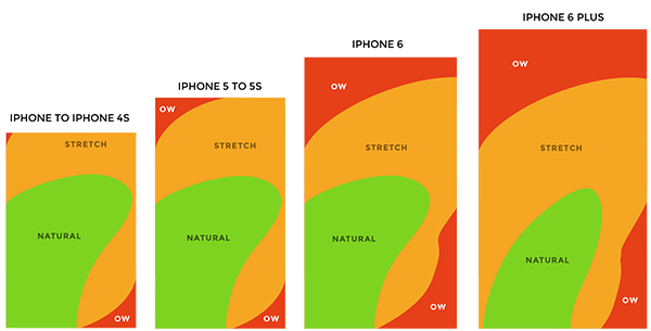 不过,我们看看不同屏幕尺寸上拇指热区的自然变化,很明显用户不会单手持握试图触达屏幕每个角落,这是自我折磨。假定他们只会改变和调整持握姿势。记住这点,我们就知道用户不会困扰于大的屏幕尺寸,他们会改变姿势来持握,并舒服地与平板手机进行交互。
