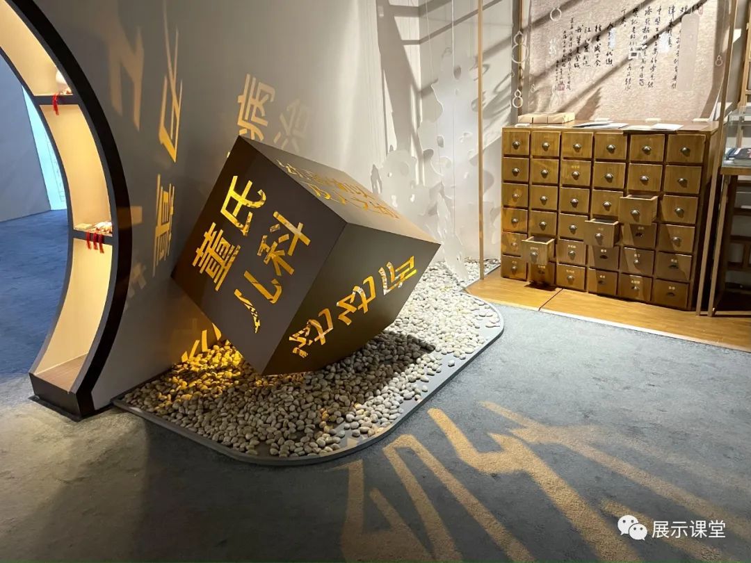 艺术布展:这个区域通过展架、牌匾、亚克力雕刻字、艺术造型雕刻与互动药柜相结合的多种方式展示董氏儿科用药六字诀内容。