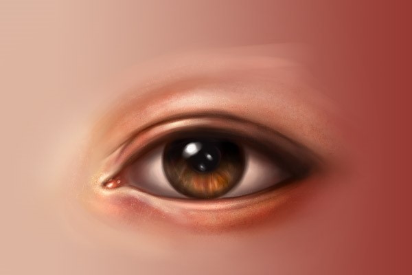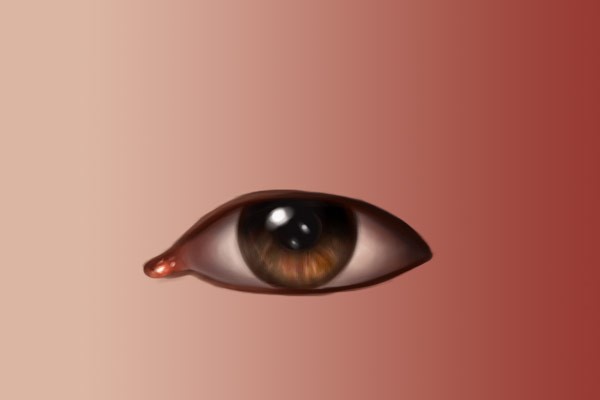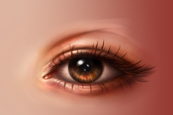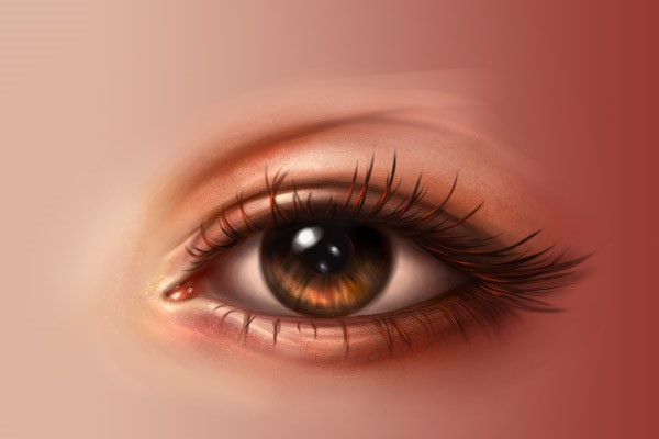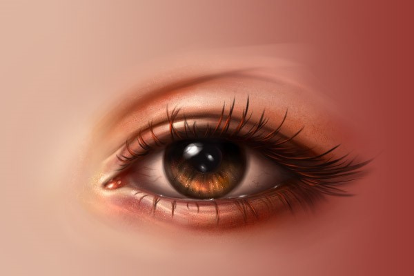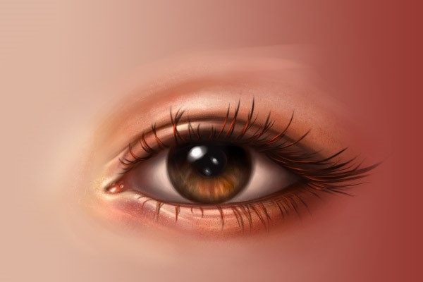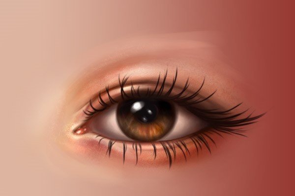 使用同样的笔刷,用浅色画出眼角内部,然后再在眼角周围使用深一点的颜色。同时在附近的眼白加一点粉色。下面两张图是有线稿和没线稿的效果,大家可以对比一下。