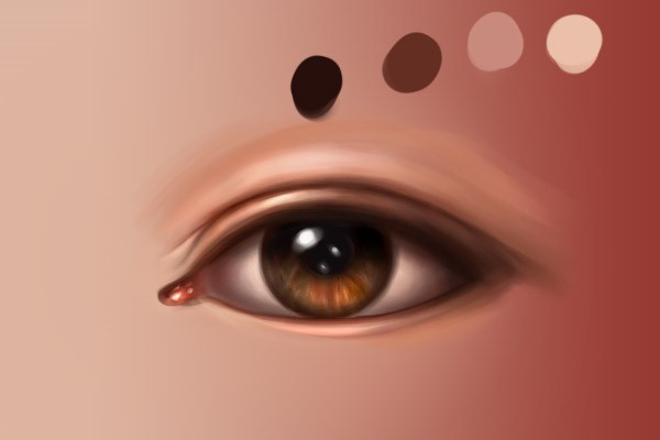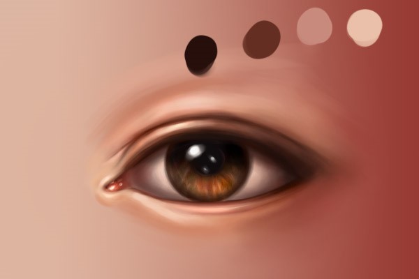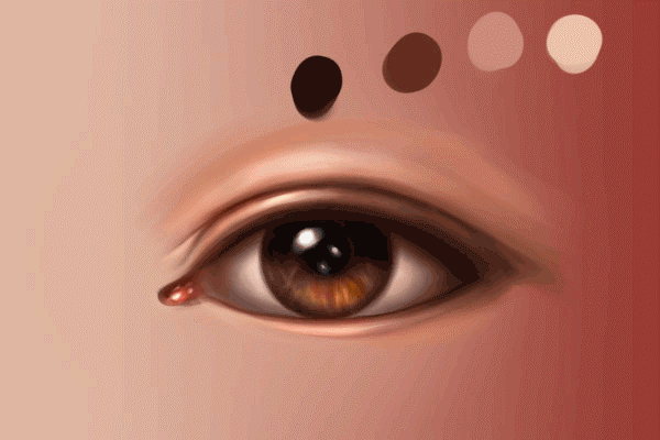 让我们先在下眼睑右侧用#260f0b轻描,然后再在小褶皱处使用#eac0a9增加一点高光。