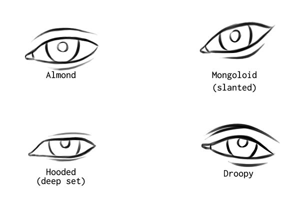 仔细观察不同人的照片,你肯定会发现差异。下面列举一些基础形状:从左到右从上到下依次是杏仁眼形、蒙古眼形(在其他国家的人眼中,中国人的眼睛普遍认为是这种样子。)、凹眼形、下垂眼。