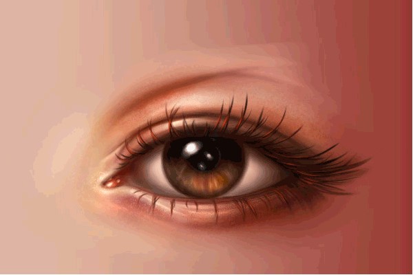 眼球是一个球体结构,由于有凸面,中间部位接收的光照最多,比较亮。离中心较远的地方由于眼睑和眼睫毛的遮挡,受到的光照会更弱,则要用更深的颜色。