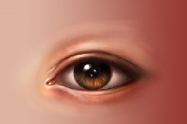 然后使用#eac0a9,在眼睛左下部和泪腺处描画,然后添加一点高光。对比下面两幅图,就能发现这一步前后的效果。