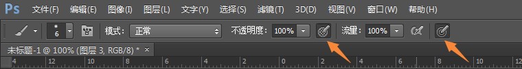 将前景色设置为#1a0906,将画笔(B)设置为硬圆笔刷,选择对“大小”和“不透明度”使用压力(同上)。