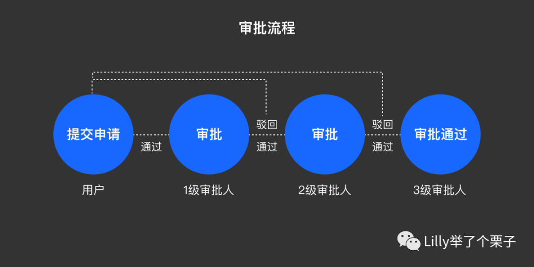 (🌰:申请报销,用户-提交申请,根据不同公司的流程,一层一层向上审批通过或者打回,那么在这个流程中,牵扯的角色包括用户、1级审批人、2级审批人、3级审批人...)