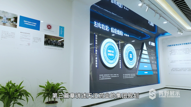 赛野展示在天江药业企业展厅项目中,延续“国医文化的传承与现代科技的革新引领”的企业模式,以科技化的手段,简洁大气的设计风格,将中医药与科技相结合,让历史与时代相连接,让中医药“传承精华、守正创新”的精神完美呈现。