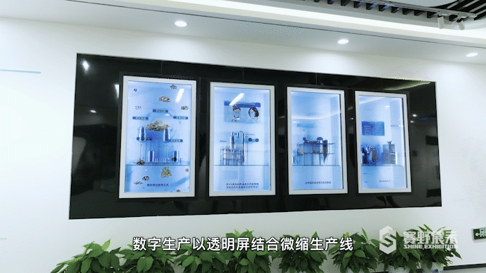 “数字生产”区域采用透明屏+微缩生产线为主,展示企业智能化生产车间,侧面讲述企业的自信与生产实力。