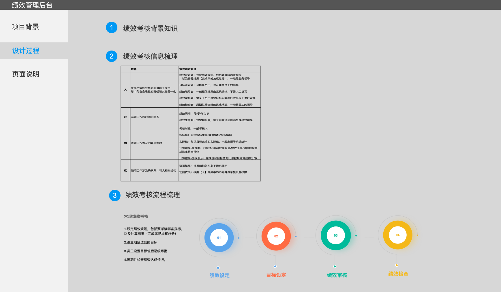 以下图为例,做一个绩效考核的模块,需要先了解绩效考核的背景,知道绩效考核的常规流程,流程中会涉及到的和系统有关的信息,例如哪些人会参与,都会做什么事情,什么事情做,负担什么样的责任产出什么样的信息,以及对应的权限。