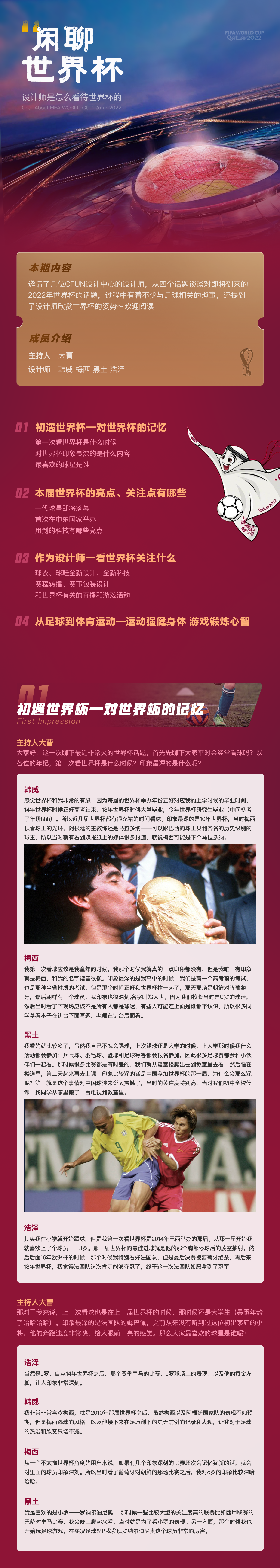 本期,邀请了几位CFUN设计中心的设计师,从四个话题谈谈对本届卡塔尔世界杯的看法,过程中有着不少的趣事与干货呢~
