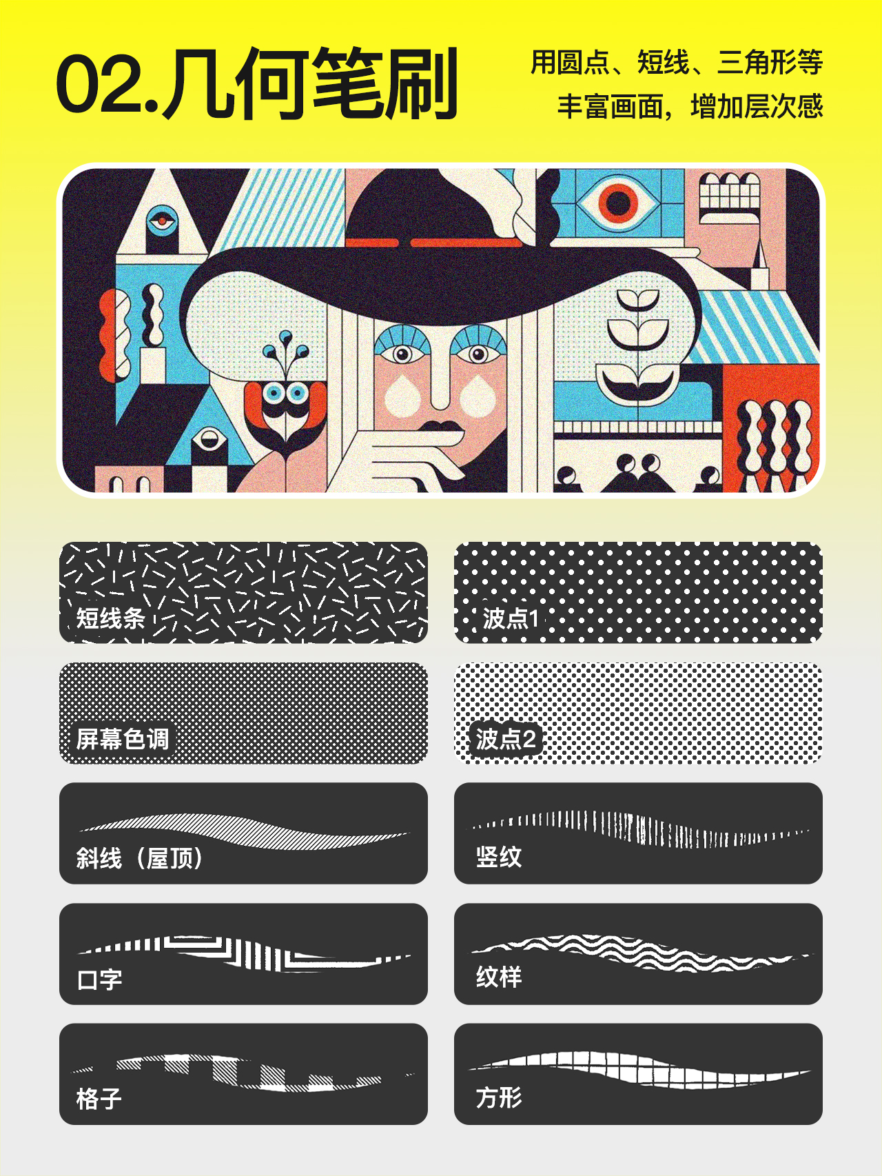 圆点、短线、三角形、方形等几何形状笔刷。丰富画面、增加层次感。