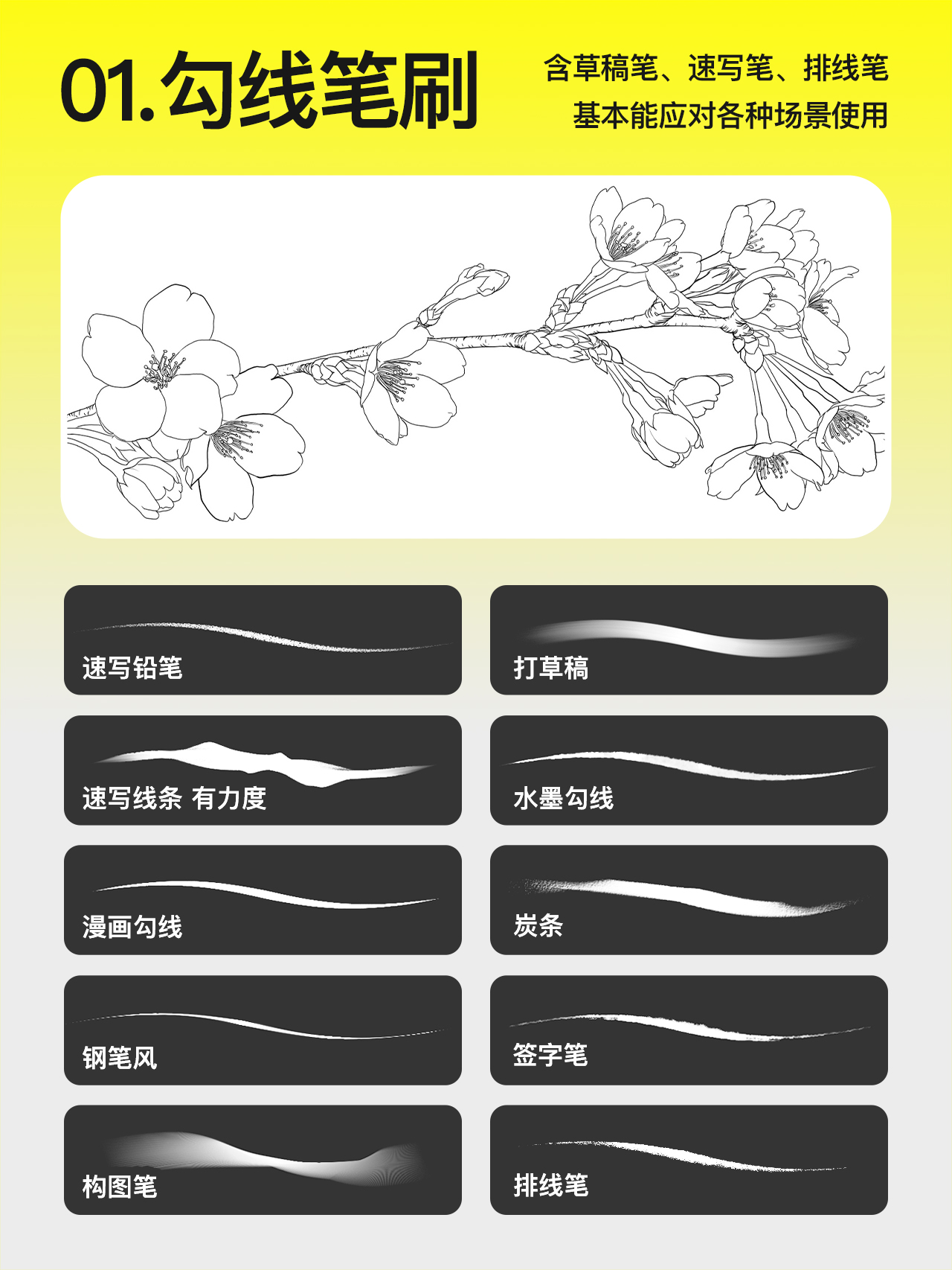 这次总结的有草稿、构图、速写、排线等笔刷,基本能应对各种场景使用。