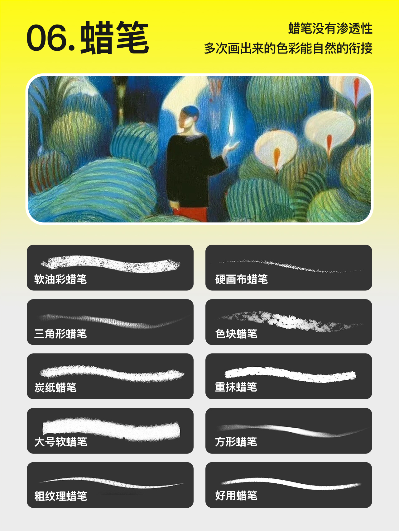 蜡笔没有渗透性,多次画出来的色彩、笔触也能自然地衔接在一起,通过厚涂,也能画出沉着厚实的艺术效果。蜡笔风格需要随心去画,就像童年时拿起蜡笔那样。