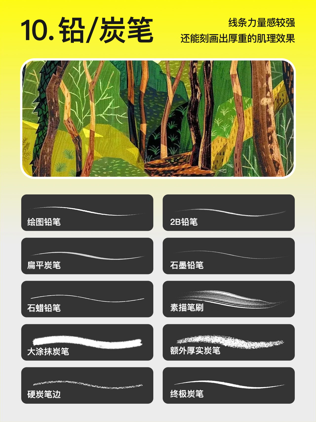 比较适合画涩的线条,线条力度感较强,还能擦出不同的肌理效果。作为上色笔刷也能刻画出较为轻盈、通透的质感。