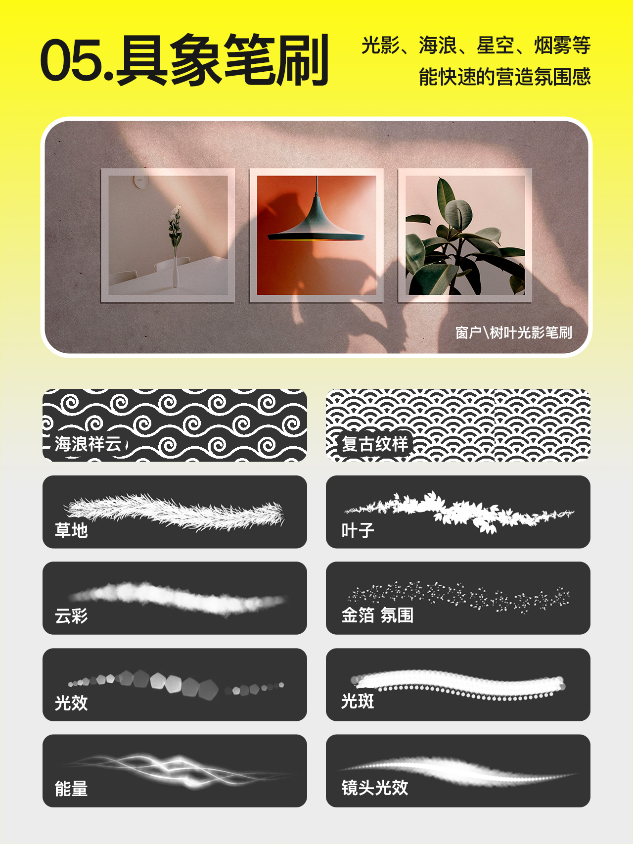 包括光影、烟雾、海浪、星空、草地等笔刷。能快速的营造氛围感、空间感。