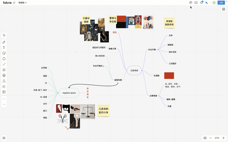 由此可见,我们需要一个更符合心流、更趁手的工具来帮助我们制作情绪板。以上这些情绪板就是用fabrie制作的,还有很多各种各样形式的情绪板在fabrie中诞生。