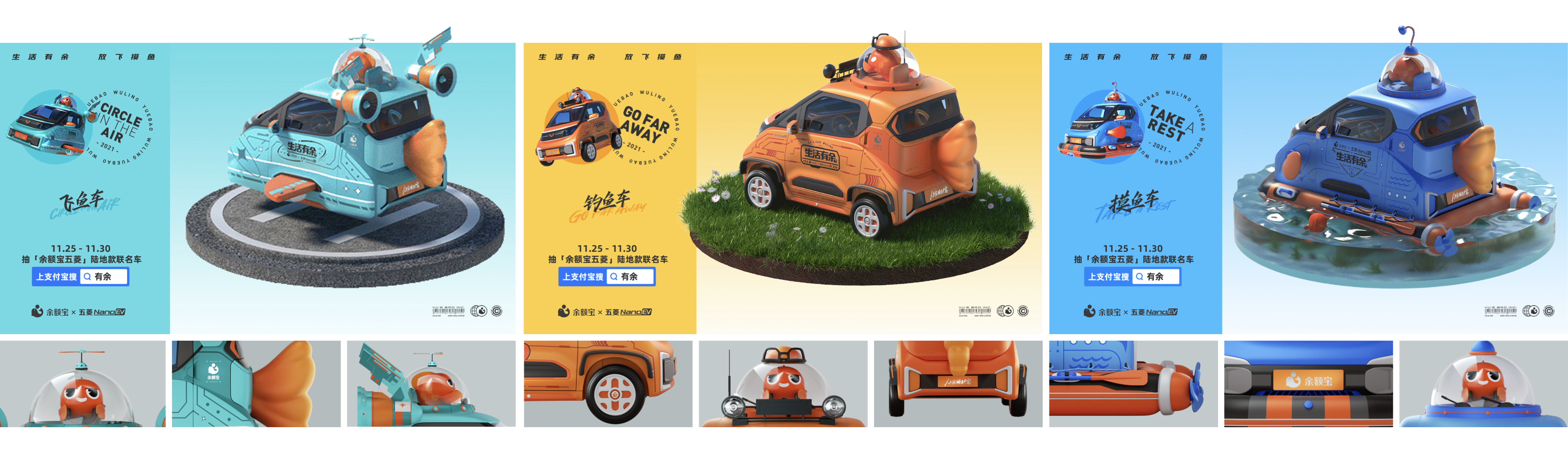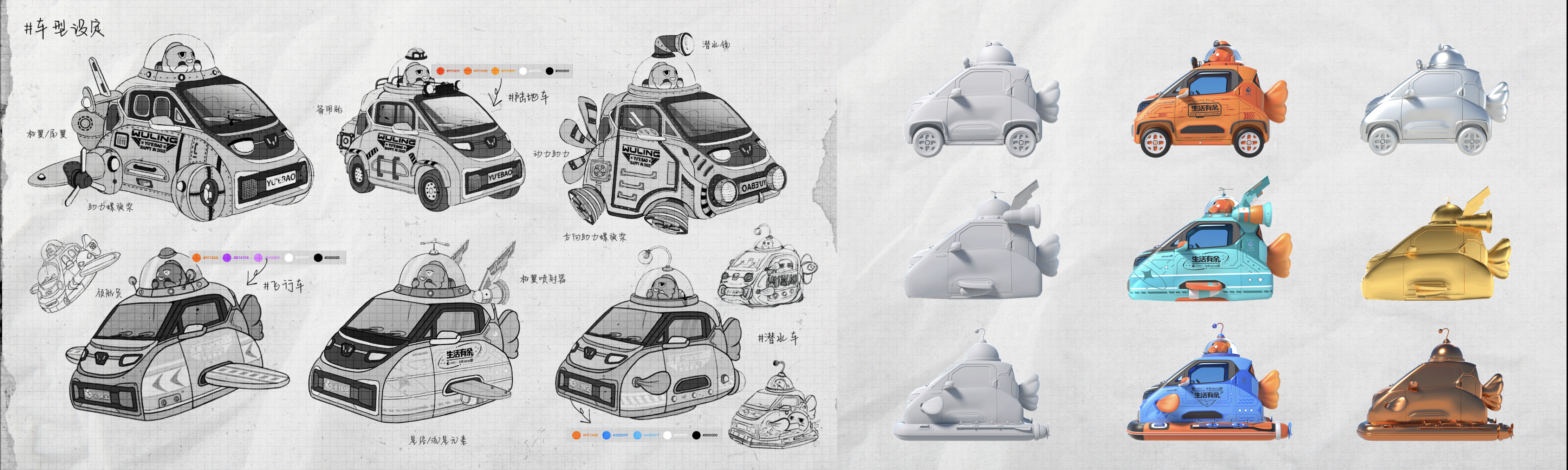 五位数的人民代步车,正成为年轻人的刷街座驾。改装五菱宏光成为一种风潮后,改装的不是一辆车,而是为自己的生活创造一种新的出行方式。结合五菱改装的可玩性,打造了三款“大人的玩具车”,将机械风与游戏感结合,从草图、试色到3D模型进行全案设计。