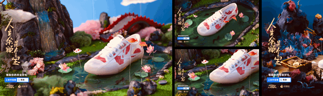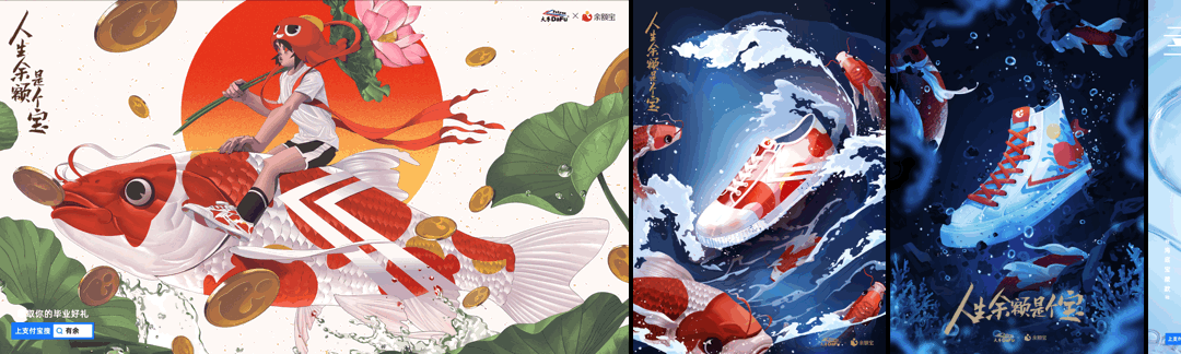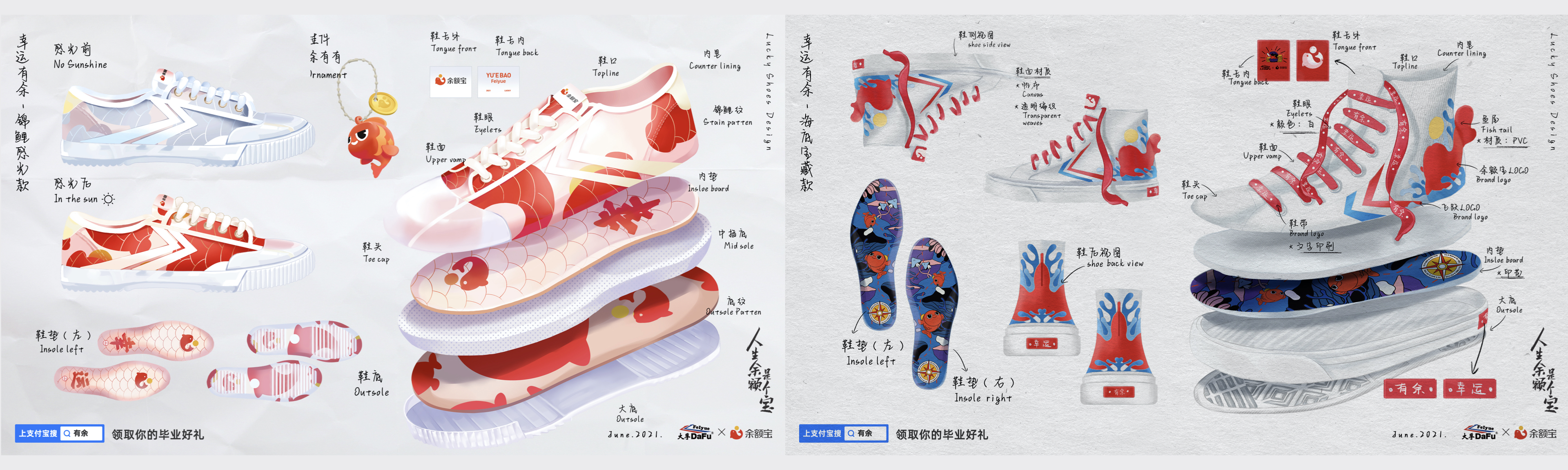 华流国潮不是平地而起,但希望穿着国潮也能如履平地。余额宝的第一站联名就是和我们的国民帆布鞋飞跃进行了合作,为即将踏出校园的毕业生们设计了两款鞋,分别搭配两种不同的故事演绎,称之为 “幸运有余系列”。