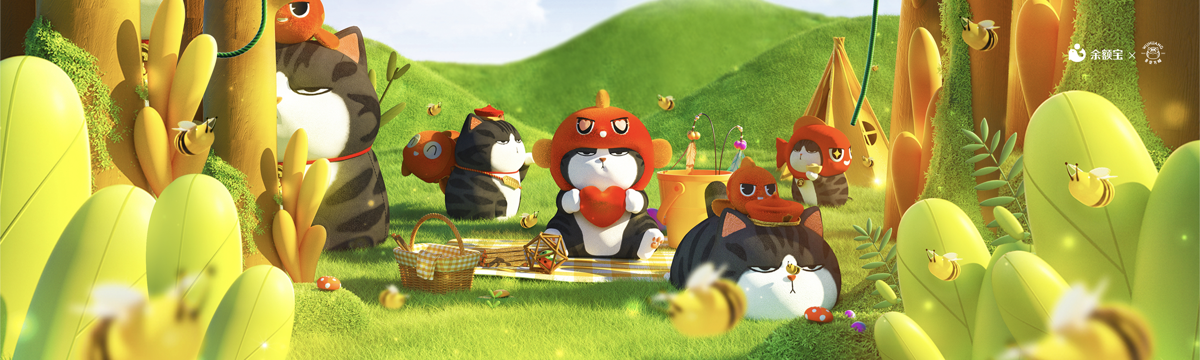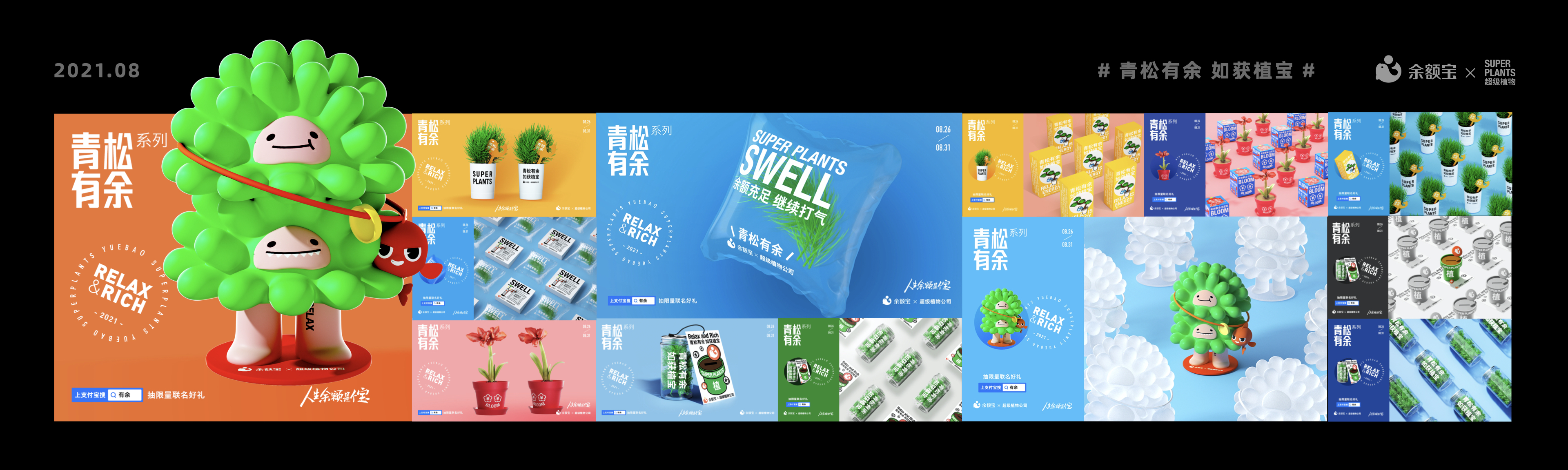 超级植物公司,新生代家居品牌,余额宝与爆款“青松娃娃”和新品“膨胀“系列联名,结合 “放青松”的品牌理念和特色文案,提出“青松有余,如获植宝”的主题概念,借由植物的美好寓意,给新一代职场人传递放轻松但不躺平,做社会人但不做社畜的奋斗理念;