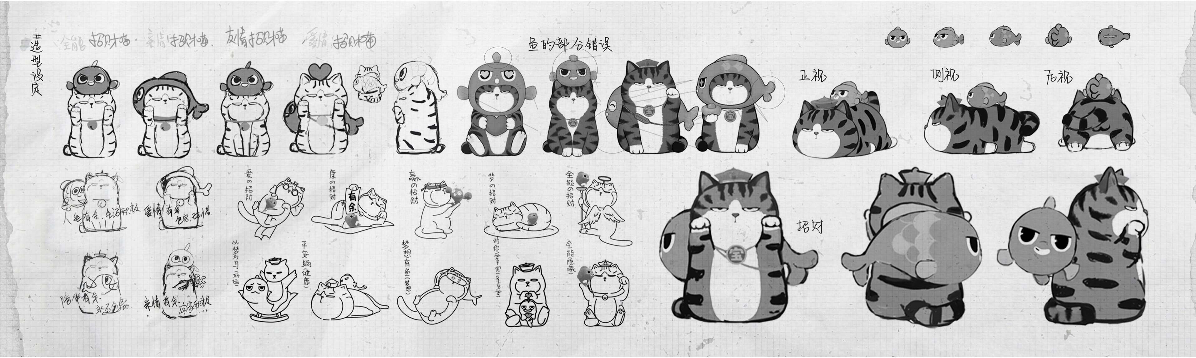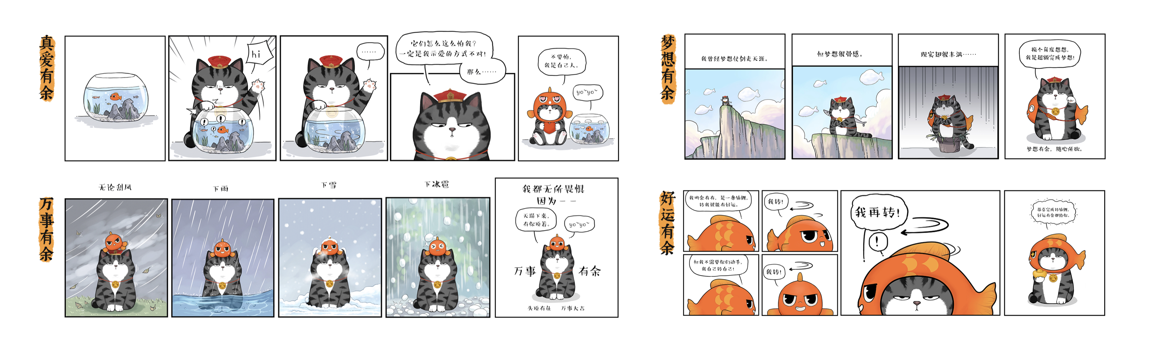 国漫千千万,锦鲤和猫来作伴。结合吾皇万睡IP的设定和世界观,根据“万事有余,攒出积极”的主题概念,分别代表着爱情、健康、梦想、好运等美好寓意。