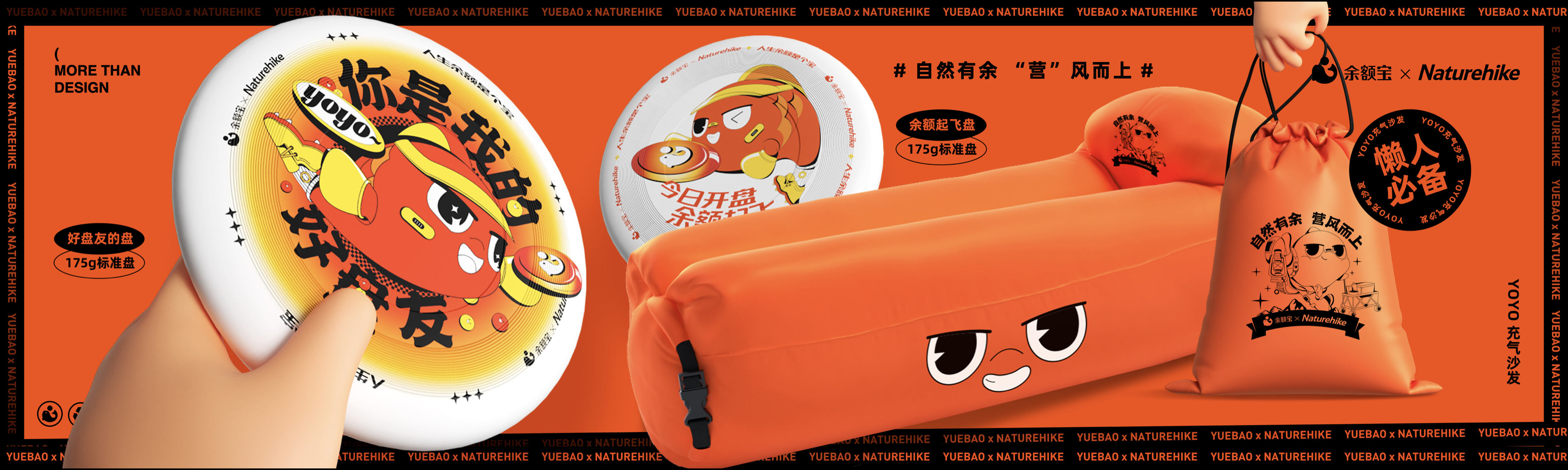 “世界那么大,我想去露营”,刮起的露营风使每个人都想到没有天花板的地方去,余额宝也趁着这股热风,提出“自然有余,营风而上”的主题,出了系列的露营装备:有飞盘、沙发等。希望陪伴年轻人去贴近自然,保护自然,做回真实的自己。