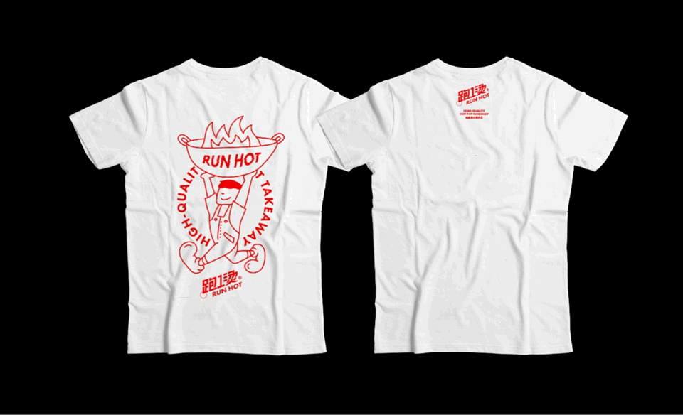 跑一烫 RUN HOT是一家主营高品质火锅外卖的小店,其LOGO设计刻画了一个举着火锅疯狂奔跑的小人,幽默地体现了品牌的火锅精神:希望更多人在家就能吃到高品质的地道重庆火锅。