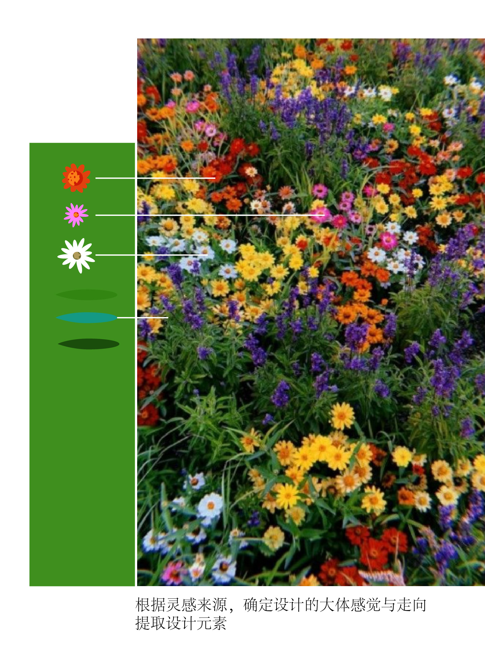 这一步是头脑风暴过程,看到图片的第一刻,相信你们脑里都会浮现一种小碎花连衣裙飘飘灵动的效果吧,那么有了一个大致的方向,就要开始设计元素的提取了,不同颜色的花朵,及叶子是我们一眼就能看到且最有用设计元素(那在这一步我们要注意些什么呢1,花卉的颜色,2,形状及大小,3,朝向等,这些都是决定最终设计的丰富成都及真实效果哦)