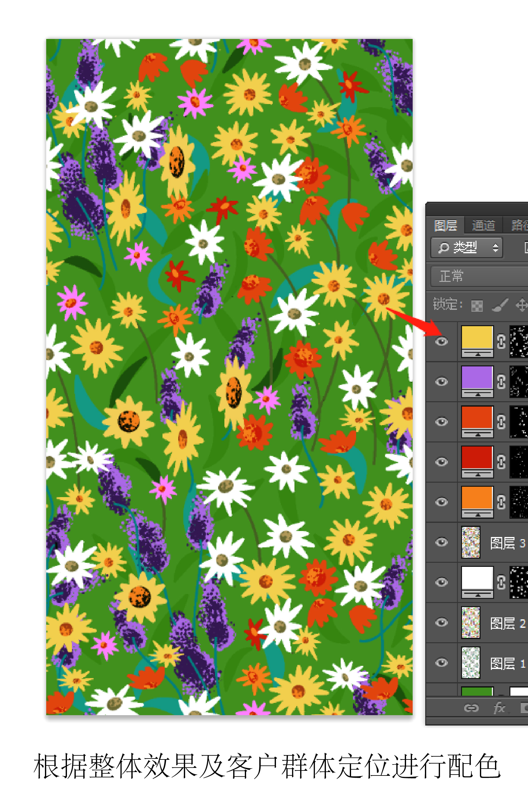 这一步,也是比较重要的一部,就是进行配色,以图片的整体效果作为一个参考,结合客户群体的年龄及职业风格需求,进行一个配色,注意颜色的协调性,一般一个花稿都要有三个配色供客户挑选,这里只给大家展示一个配色的设计过程,其他配色效果,展示不上传哦