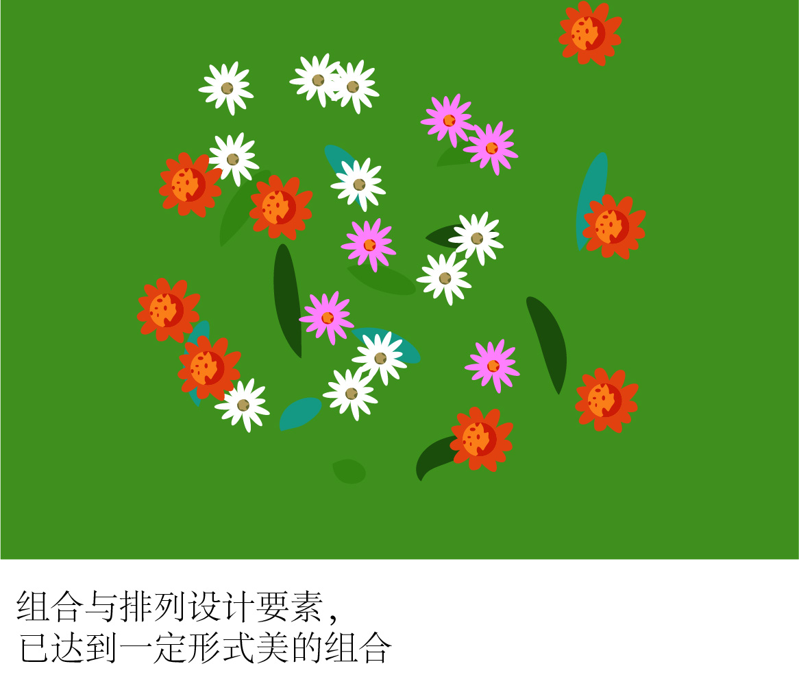 这一步是通过提取的设计元素进行一定的疏密排列,注意形式美法则,使其呈现出具有美感的排列效果(注意不同颜色设计元素的位置分布,及前后关系)