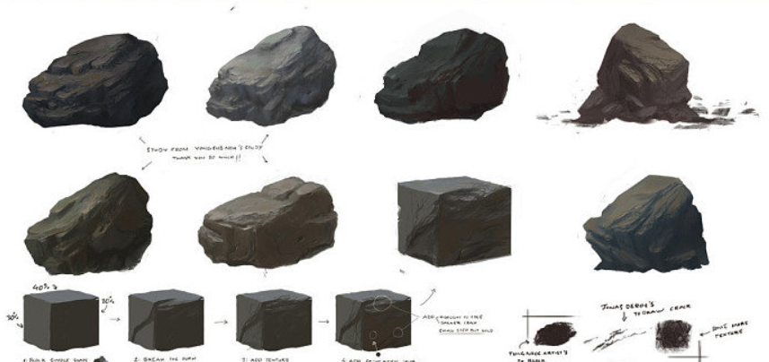 石头表面质感坚硬而易碎,因为自然的侵蚀,整体造型相对不规则,表面上呈现凹凸不平的质感,有明显的切线转折、裂纹等,而石头材质粗糙,光源照射表面呈漫反射扩散,所以固有色相对比较稳定