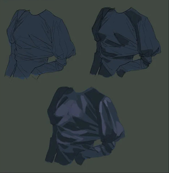 布料因为在揉搓挤压时,发生塑性弯曲变形而形成褶皱,而褶皱之间因受到不同的力的影响整体呈疏密变化,不过褶皱数量更多的还是由布料本身的厚薄决定的,而折痕之间明暗关系明确, 在刻画褶皱的细节需要明确褶皱的形状和流动方向