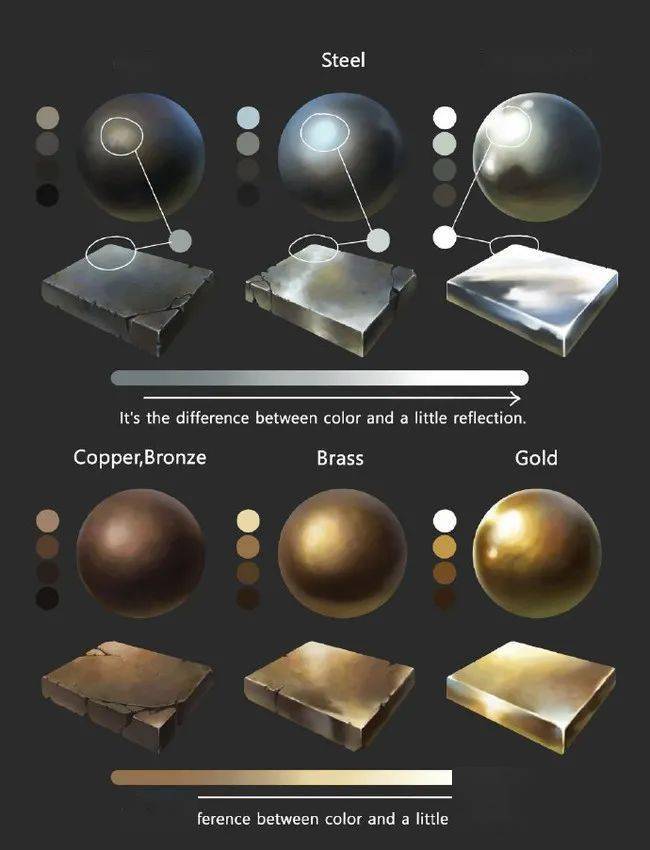 金属表面光滑,受光源照射呈镜面反射,高光明显,明暗对比关系明确,会反射环境中的其他颜色,而金属表面常伴随着细小的划痕,划痕较为圆滑,无裂痕,因为金属材质本身具有延展性,而粗糙的金属矿石色阶变化跟石头类似,但因镜面反射,高光比石头更为明显