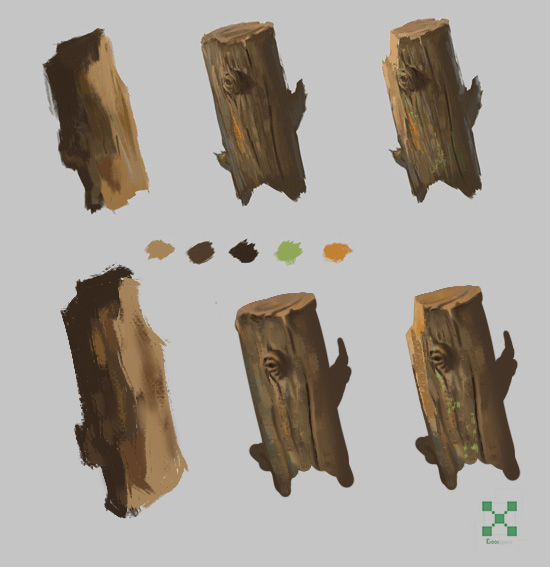 木头表面有非常细长且粗糙的纹理,呈现不规则的条纹,具有“无规律”的特性 ,在树木纹理突出的位置,一般都会有不太明显的受光区域,会沿着纹理一道前进,而这些凹凸的纹理特征,使受光和闭塞非常多,所以刻画的时候抓住主要的纹理区域刻画即可,其他的面零碎带过,形成主次对比,规避因为零碎导致“花”的现象,而木由植物纤维组成,而有一定的韧性,但易切割,切面有年轮的纹理,在光线照射下呈漫反射