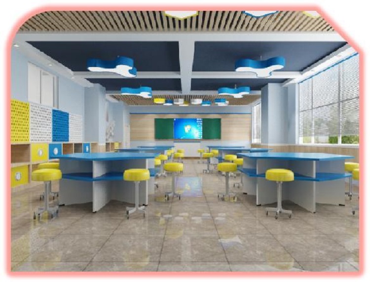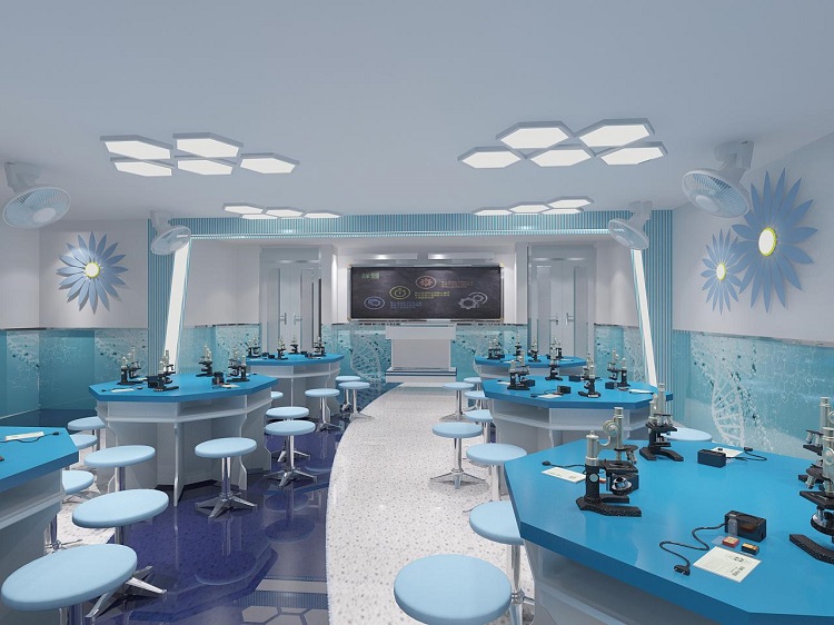 河南学校科学教室设计要有一定原则,根据教学实际有效整合课程设计、教学实施环境,推行自主合作探究的学习方式,培养学生合作交流能力、实践创新能力,科学实验室建设原则引导教学变革创新,倡导符合功能。科学教室设计整体可以以蓝色墙面为主,奠定实验主题基调,搭配浅木色添加暖色氛围,让整个空间色调更加协调,科学教室可采用多媒体和传统式黑板为一体的教学黑板,制定教学学习目标,设计实验室手册,提醒学生注意科学实验室安全原则。