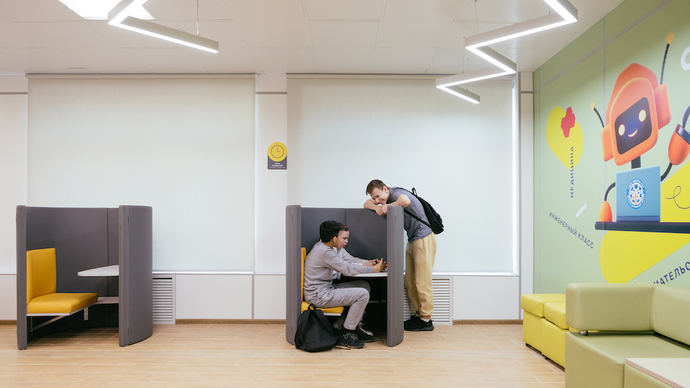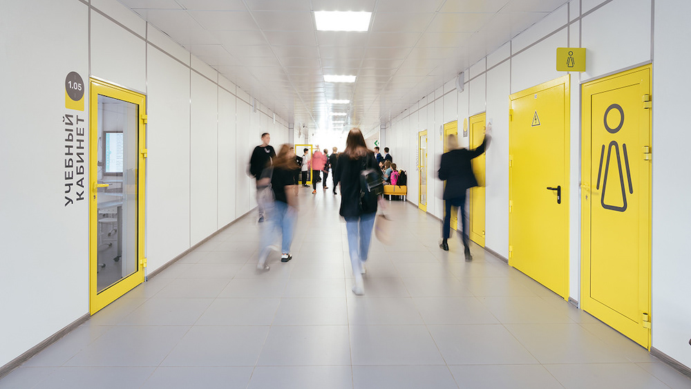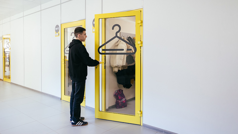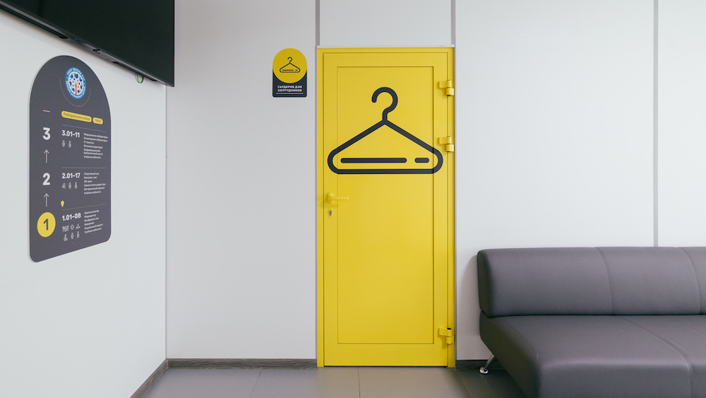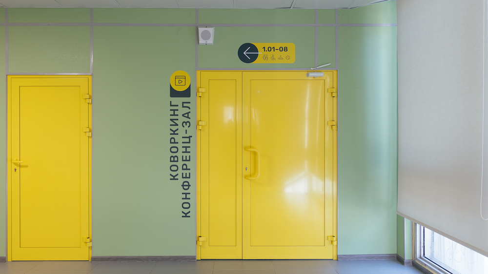 针对莫斯科第947学校复杂的环境,Sergey Scoler采用黄色、灰色和白色的配色,大面积的黄色凸显了信息标识,有助于访客快速定位。灵活的层级划分模式,将空间清晰地呈现出来。在公共区增设了二维码,便于访客获取更完整的信息。